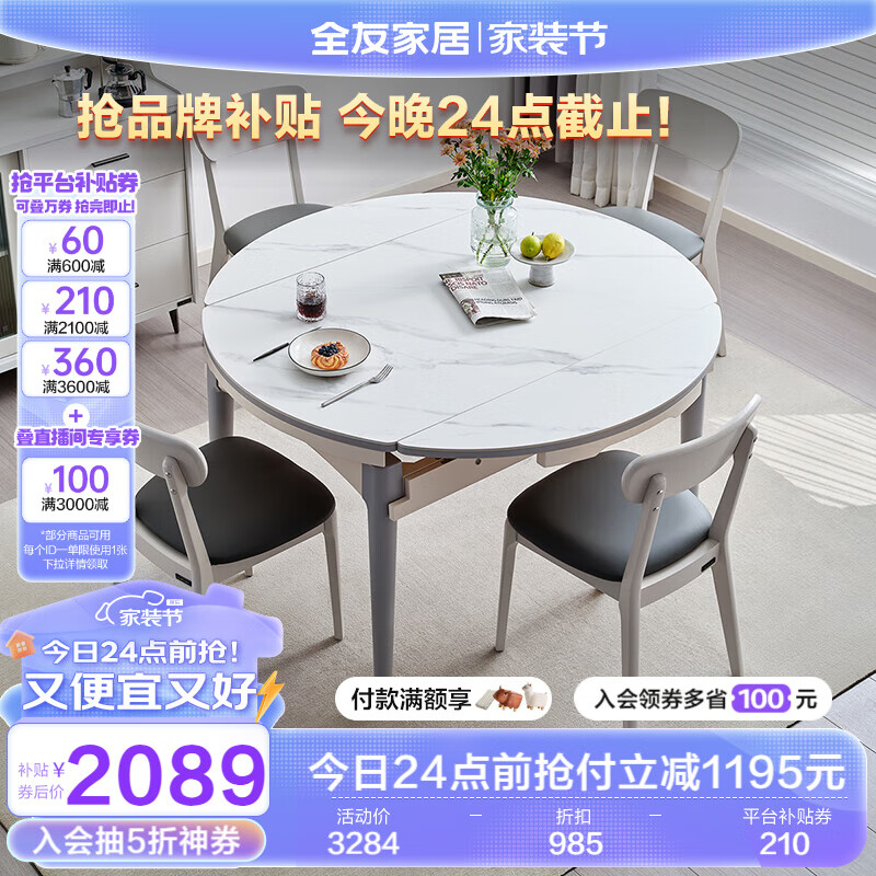 全友家居 餐桌现代简约岩板餐桌椅组合方圆两用折叠餐厅吃饭桌DW1028价格:3284.29元!