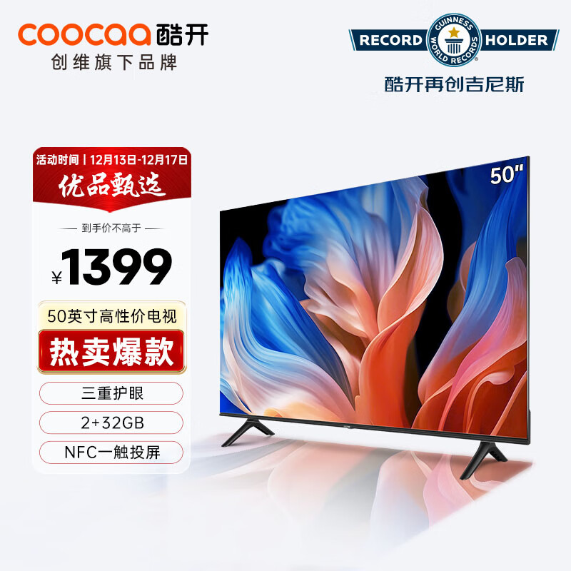 酷开创维K3 50英寸电视 2+32G内存 无边屏 智能语音 多功能投屏平板游戏液晶电视机以旧换新50P3D价格:1399.00元!
