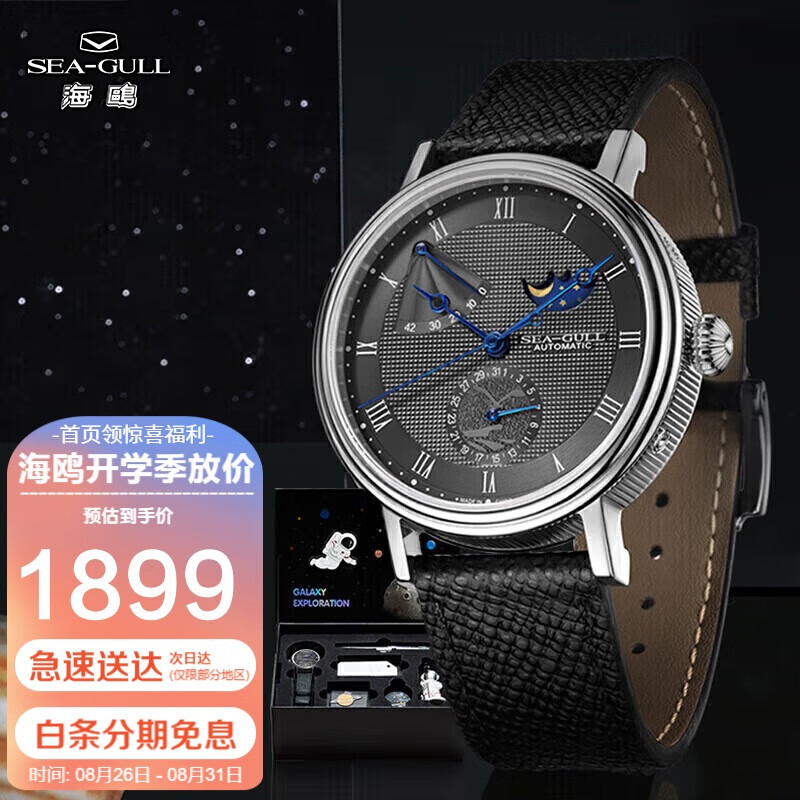 海鸥(SEAGULL)手表男士自动机械表 男表送男友礼物 月相腕表文创礼盒(玄夜)价格:2109.00元!