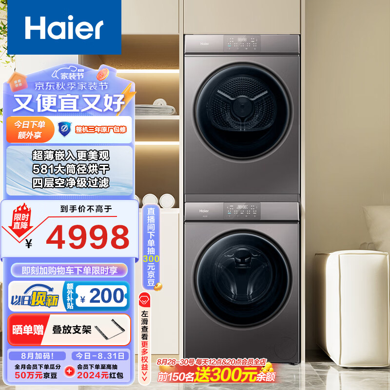 海尔(Haier)超薄全嵌洗烘套装 10KG滚筒洗衣机全自动+热泵烘干机家用 速溶窗高效洗涤 MATE36+36S 以旧换新价格:4998.00元!