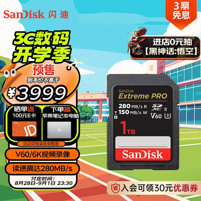 闪迪(SanDisk)1TB SD内存卡 6K视频 V60 U3 C10 高速相机存储卡 读速280MB/s 写速150MB/s 高清拍摄 畅快连拍价格:3999.00元!