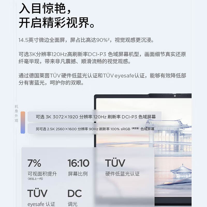 5、买的酷睿AIULtra5的,价格合适。重量较轻,充电很快,100W,电池容量大,年轻时尚。屏幕看起来很舒服。二个风扇,声音不大。