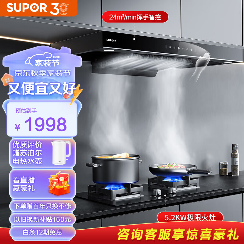 5、家里一直都用的苏泊尔抽烟机,这款颜值更高了,而且特别方便,挥手就能开关机,抽力也很大,吸烟效果很好。价格也很合适,性价比很高。