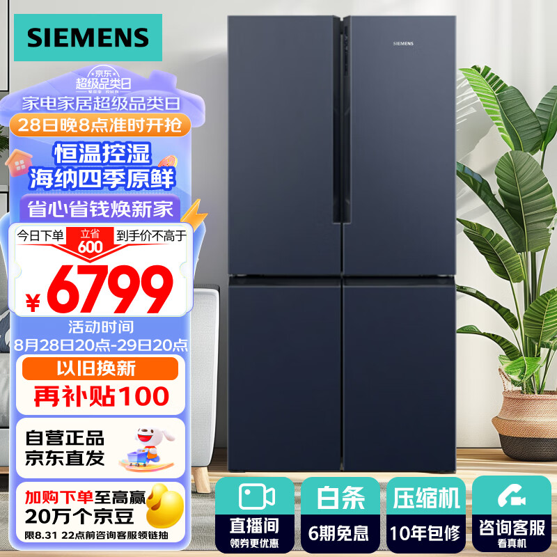 西门子(SIEMENS)605升十字四开对开门家用冰箱超大容量一级无霜冷藏保鲜大怪兽湖蕴蓝以旧换新K56L56CMEC价格:7199.00元!