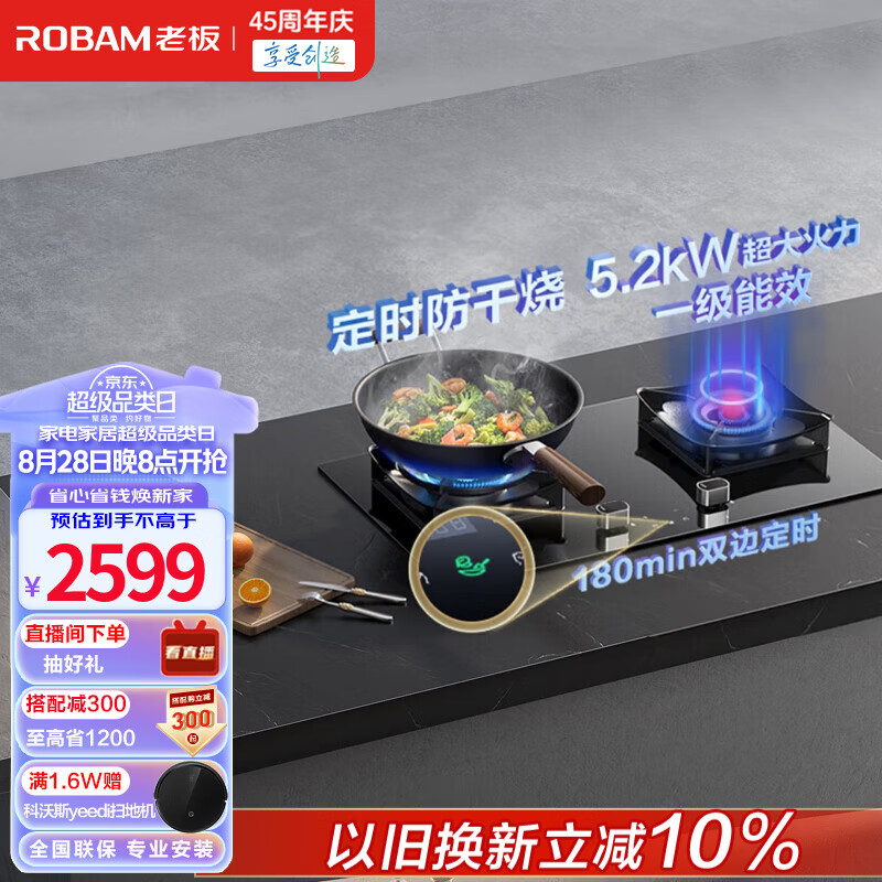 老板(Robam)燃气灶JZT-51B0A家用灵犀智感定时 防干烧 猛火燃气灶嵌入式5.2kW钢化玻璃易清洁可调节底盘天然气 51B0A大火力灶具价格:2599.00元!
