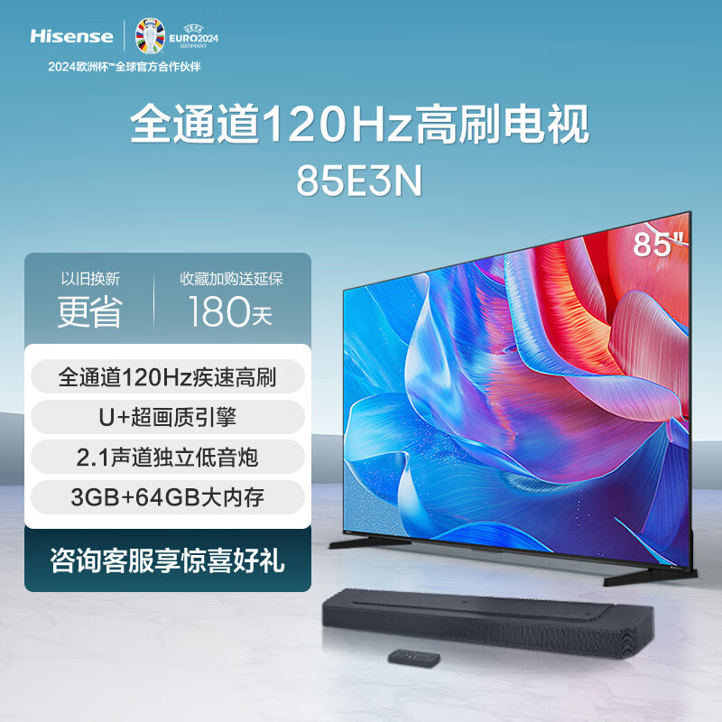 海信电视85E3N +BAR300沉浸追剧套装 85英寸 全通道120Hz高刷 U+超画质引擎 游戏智慧屏电视价格:6898.00元!