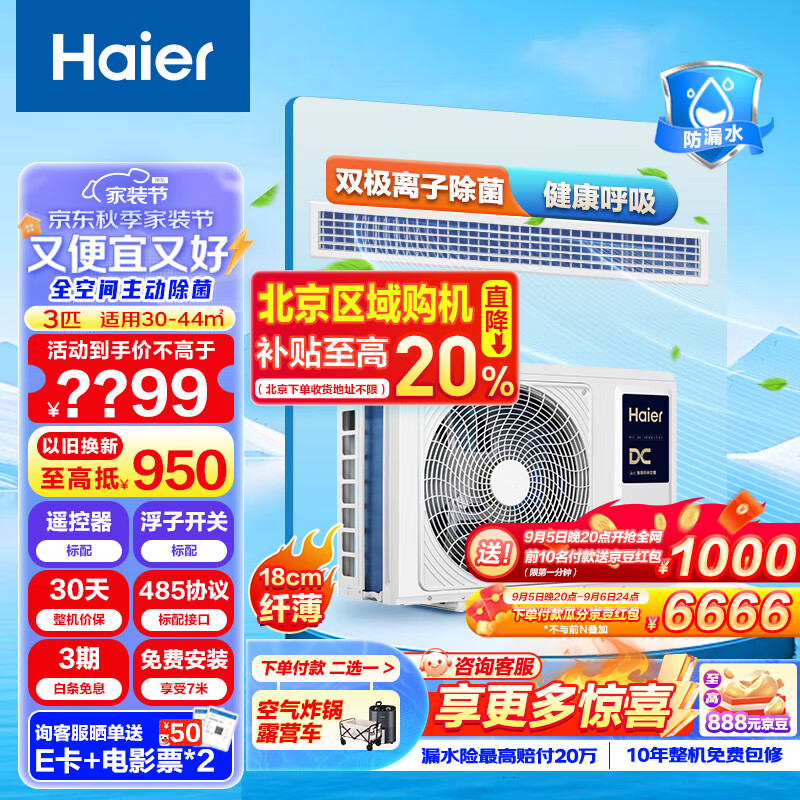 海尔(Haier)中央空调 风管机一拖一 雷神者 3匹嵌入式空调 全直流变频一级能效 KFRd-72NW/72ECF81包安装 京配价格:7299.00元!