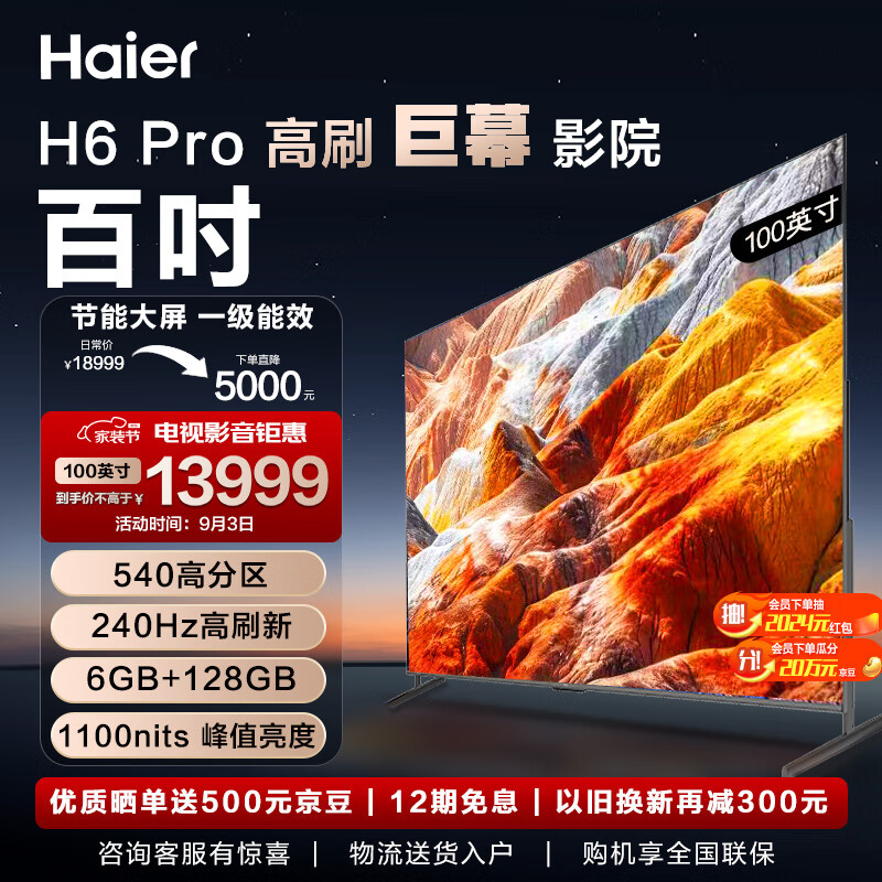 海尔(Haier)100H6 Pro100英寸540分区巨幕240Hz屏1100nits峰值亮度4K智能电视6+128G北京以旧换新一级能效价格:13999.00元!