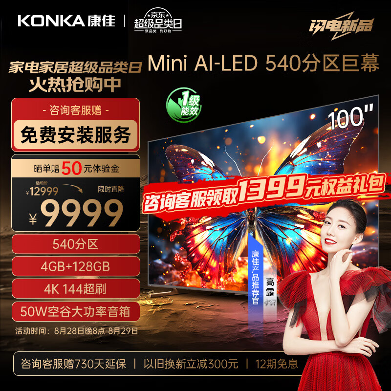 康佳电视 100G7 PRO 100英寸 Mini LED 540分区 144Hz 4K超清巨幕 会议平板 北京以旧换新一级能效98价格:9999.00元!