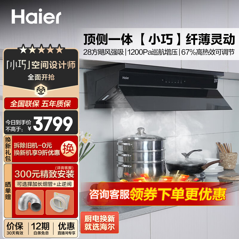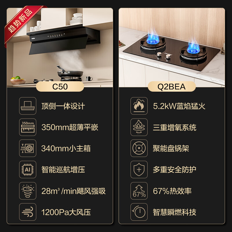 海尔(Haier)抽油烟机 【小巧】烟灶套装顶侧一体 超薄平嵌欧近一体 变频28风量大吸力 5.2kw+67%天然气C50+BEA价格:4221.00元!