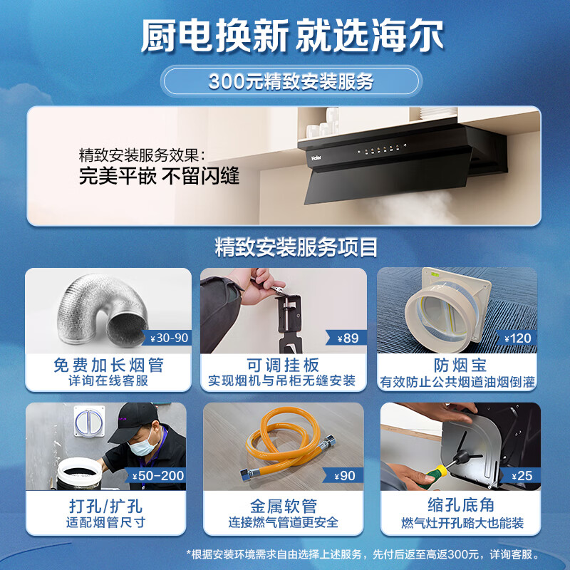 不得不说的是海尔CXW-358-E900C50的网友有不少,这回就给大家介绍一下,这个新出来的,很受欢迎,安装满意。海尔小巧油烟机外观很赞,很省空间。燃气灶火焰非常静音。抽油烟抽力强,安装师傅很细心。