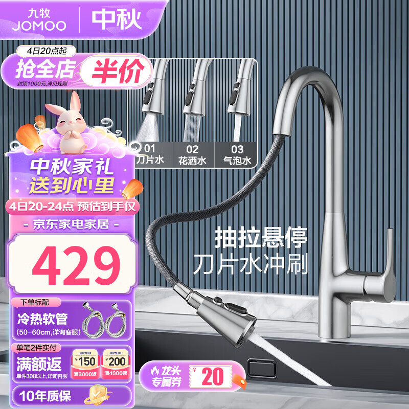 九牧(JOMOO)抽拉悬停厨房水龙头冷热出水可旋转三档切换龙头33098-385/1B2-Z价格:479.00元!