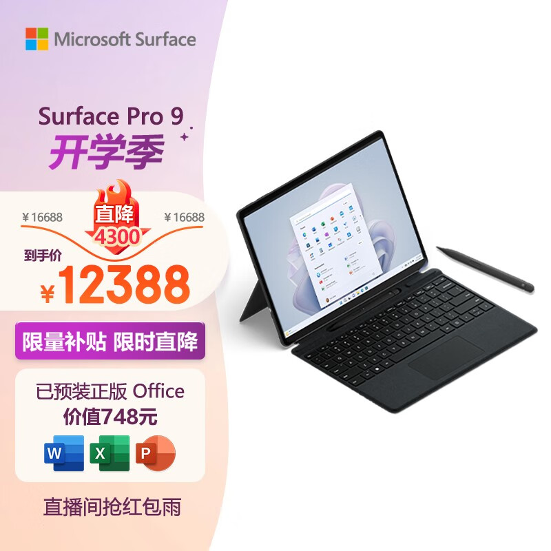 微软Surface Pro 9 石墨灰+典雅黑带触控笔键盘盖i7 16G+512G 二合一学生平板13英寸120Hz触控屏笔记本价格:12388.00元!