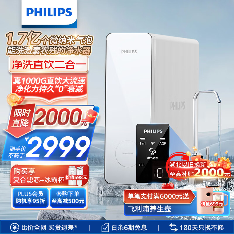 飞利浦(PHILIPS)净水器家用 1000G双出水微气泡洗净水器 果蔬除菌去农残激素 反渗透厨下直饮净水机AUT9101价格:2999.00元!