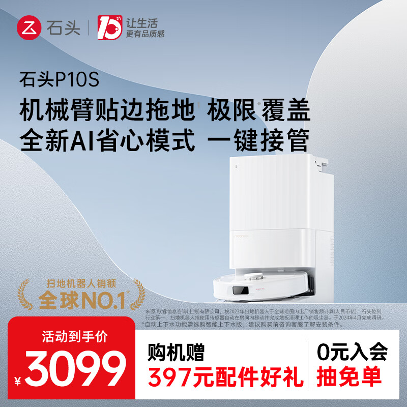 石头(roborock)扫地机器人扫拖一体 P10S 扫拖洗烘一体机 自动集尘热水洗拖布烘干补水擦地拖地 A10000RR价格:3099.00元!