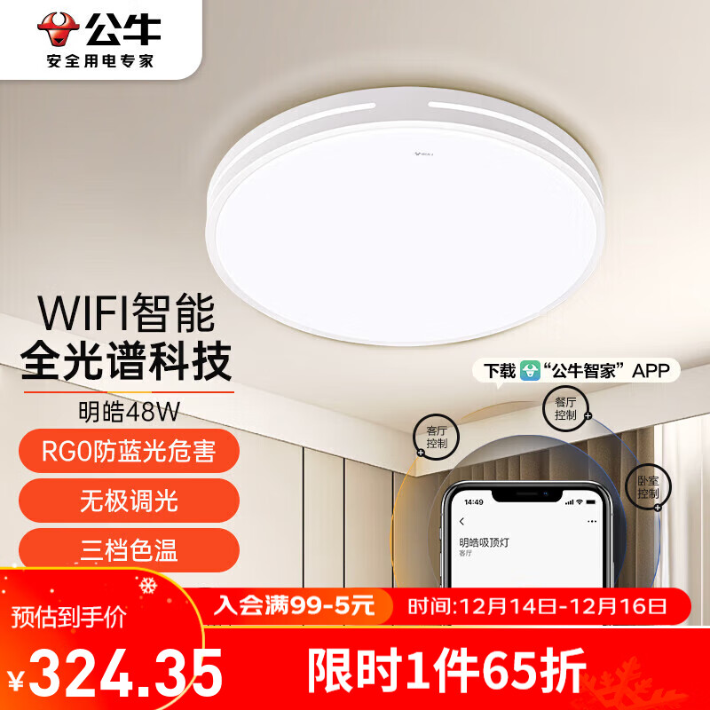 公牛(BULL)LED吸顶灯智能WIFI全光谱MX-B048E-WS明皓客厅卧室灯无极调光48W价格:499.00元!