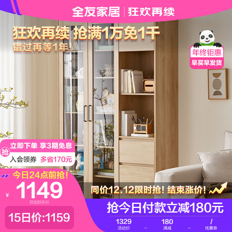 全友家居书柜北欧简约大容量储物书柜环保板材轻奢组合书柜126393价格:1329.00元!