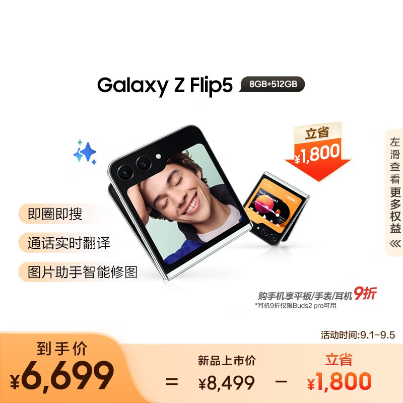 三星(SAMSUNG)Galaxy Z Flip5 AI手机 智能外屏 掌心折叠 同声翻译 智能修图摄像 8GB+512GB 云影灰 折叠屏手机价格:6699.00元!