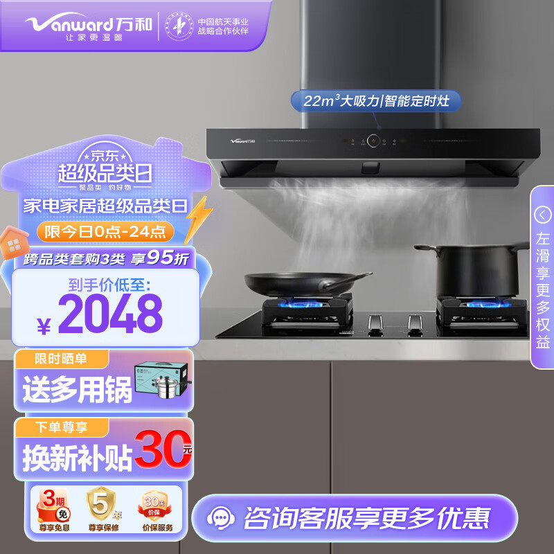 万和(Vanward)欧式油烟机顶吸式 家用自清洗 22m3/min大吸力烟灶套餐抽油烟机燃气灶具套装 X739A+T9L96(天然气)价格:2048.00元!