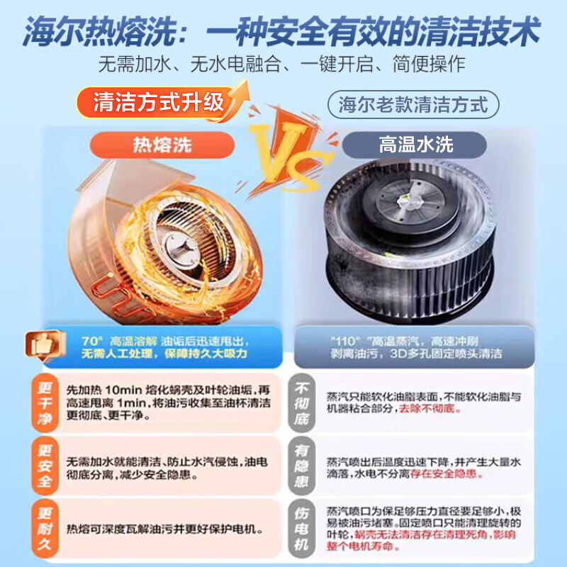1、海尔大嘴系列超薄速吸油烟机不碰头,加装不锈钢防护罩更美观,顶侧双吸,吸力大,热熔除油渍,好评。