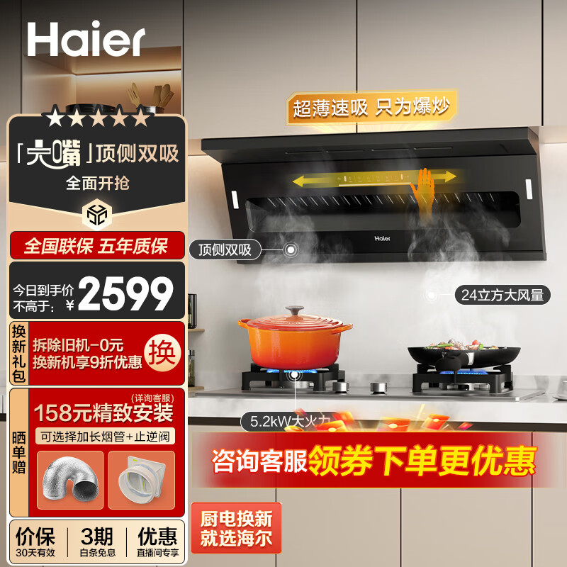 海尔(Haier)抽油烟机 顶侧双吸烟灶套装 24m3/min大吸力挥手智控 5.2kw不锈钢灶 家用油烟机燃气灶具套装C51价格:2599.00元!