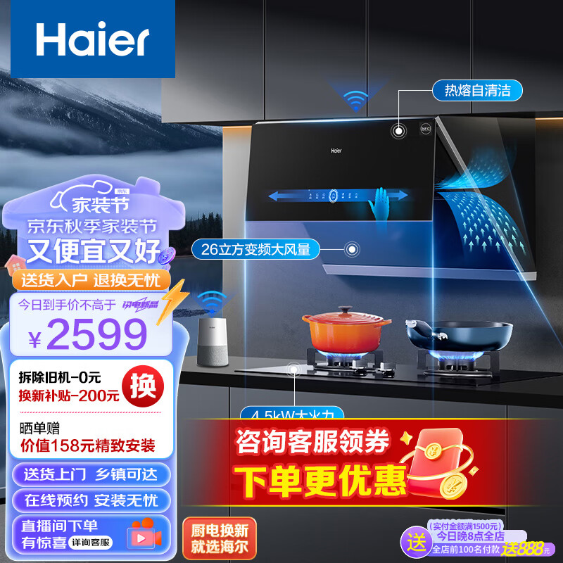 海尔(Haier)抽油烟机燃气灶 侧吸式变频烟灶套装 26立方大吸力 挥手智控 家用厨房抽烟机EC911UD+Q2BE2液价格:2599.00元!