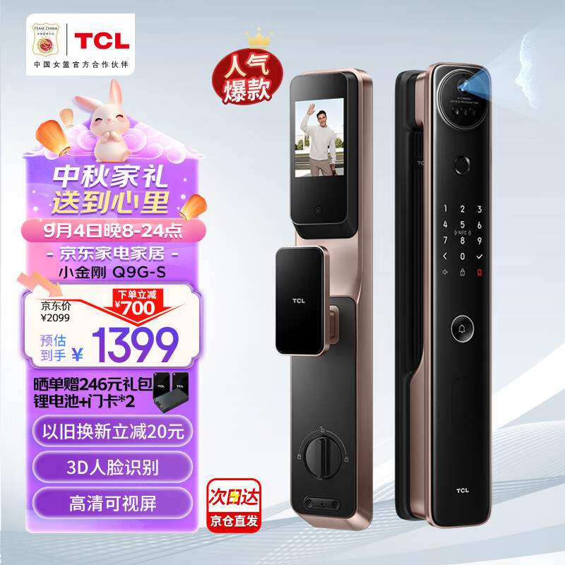 TCL智能锁指纹锁人脸识别可视猫眼大屏全自动智能门锁Q9G-S价格:2099.00元!