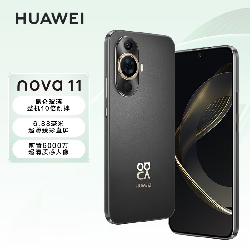 HUAWEI nova 11 超可靠昆仑玻璃 前置6000万超广角人像 256GB 曜金黑 华为鸿蒙智能手机价格:2899.00元!