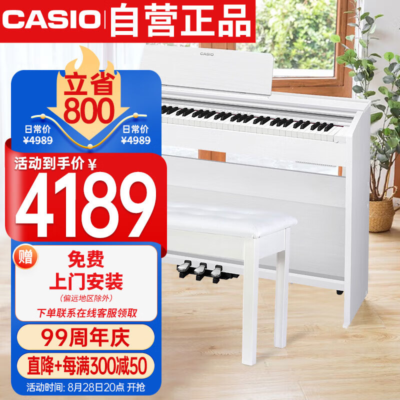 卡西欧(CASIO)电钢琴 PX870白色立式成年人儿童88键重锤智能APP互动分享+琴凳价格:4989.00元!