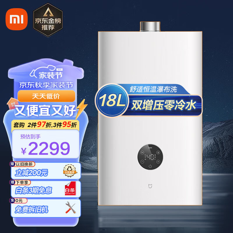 米家小米18L零冷水燃气热水器 天然气热水器 智能恒温节能省气 静音增压瀑布洗高楼层适用JSQ34-MJ01A价格:2299.00元!