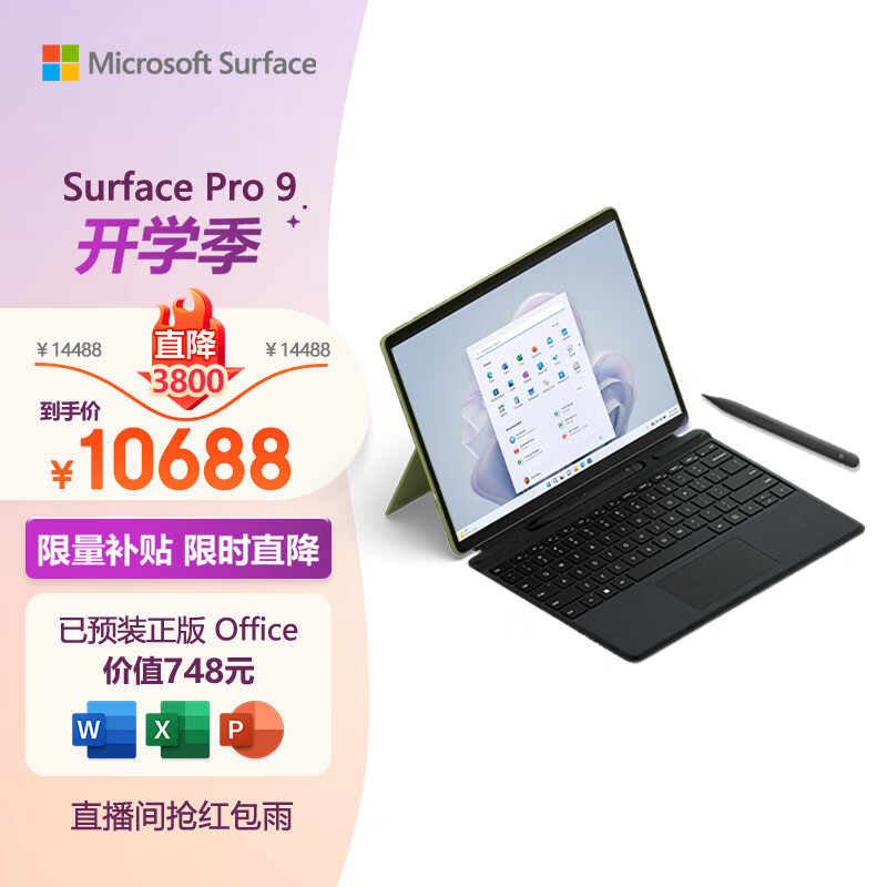 微软Surface Pro 9 森野绿+典雅黑带触控笔键盘盖 i7 16G+256G 二合一平板电脑 13英寸120Hz屏 游戏本价格:10688.00元!