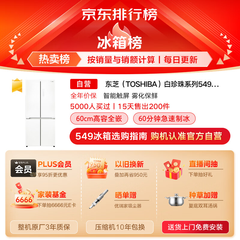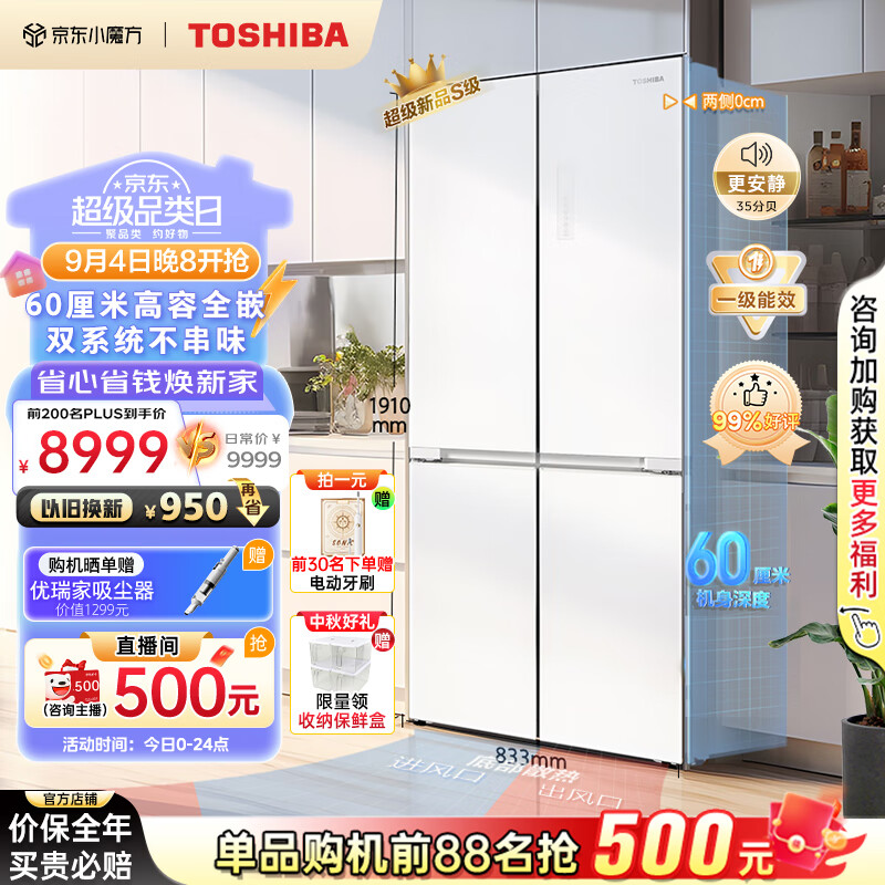 东芝(TOSHIBA)白珍珠系列549双系统60cm超薄零嵌式十字双开四开门自动制冰无霜电冰箱非大白梨GR-RF549WI-PM165价格:9469.00元!