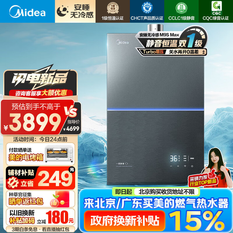 美的(Midea)16升无冷感M9S 燃气热水器天然气 安睡M9升级一级恒温 一级静音2.0 无极变频增压JSQ30-M9S Max价格:3899.00元!