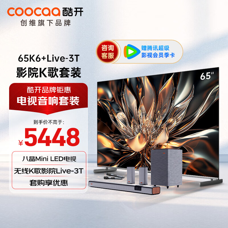 酷开创维65K6 65英寸电视 八晶Mini LED电视+无线K歌影院Live-3T 家庭KTV环绕音响 回音壁套装价格:5448.00元!