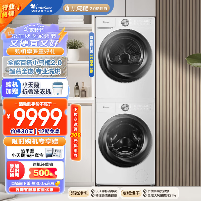 小天鹅(LittleSwan)洗烘套装 10KG滚筒洗衣机+变频热泵烘干机 超薄全嵌【小乌梅2.0奶油白】TG100S83PROW+83PROW价格:9999.00元!