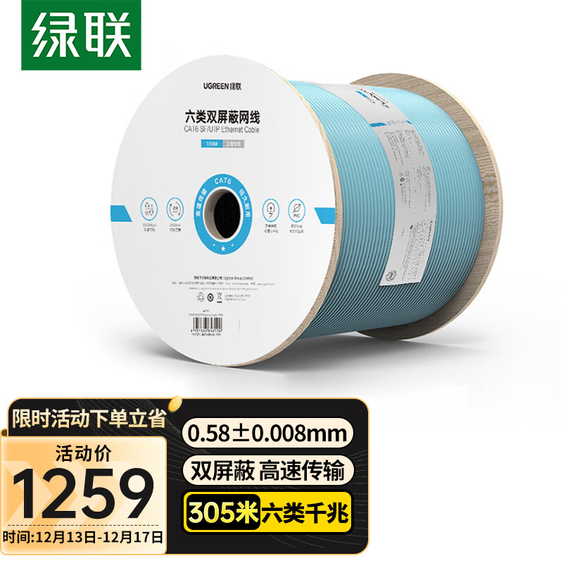 绿联(UGREEN)六类千兆双屏蔽网线 【0.58±0.008mm纯铜】CAT6类8芯双绞线 POE供电工程家装箱线305米价格:1399.00元!