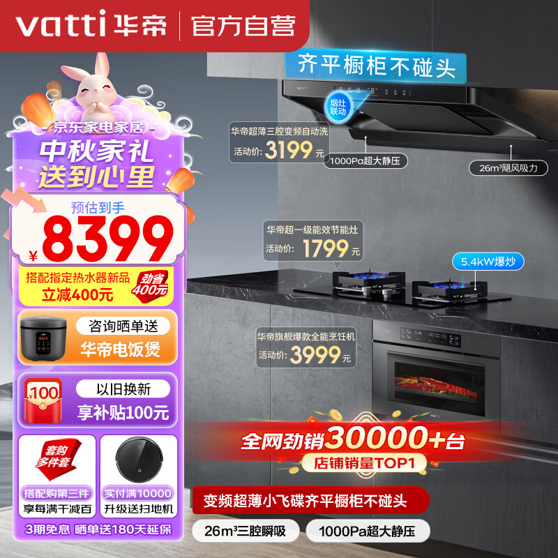 华帝(VATTI)抽油烟机变频欧式三腔26风量油烟机灶具蒸烤箱厨房多件套烟灶联动i11S36+100B+23019(天然气)价格:8699.00元!