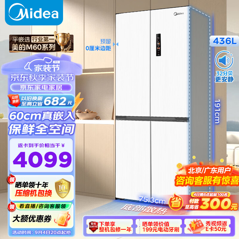 美的(Midea)M60系列457超薄纯平全嵌十字双开四开门底部散热一级变频风冷无霜白色家用智能电冰箱MR-457WUSPZE价格:4798.00元!