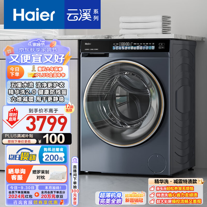 海尔(Haier)滚筒洗衣机全自动 云溪176 10公斤大容量【活水精华洗EG100BD176L】超薄家用 以旧换新 一级能效价格:3799.00元!