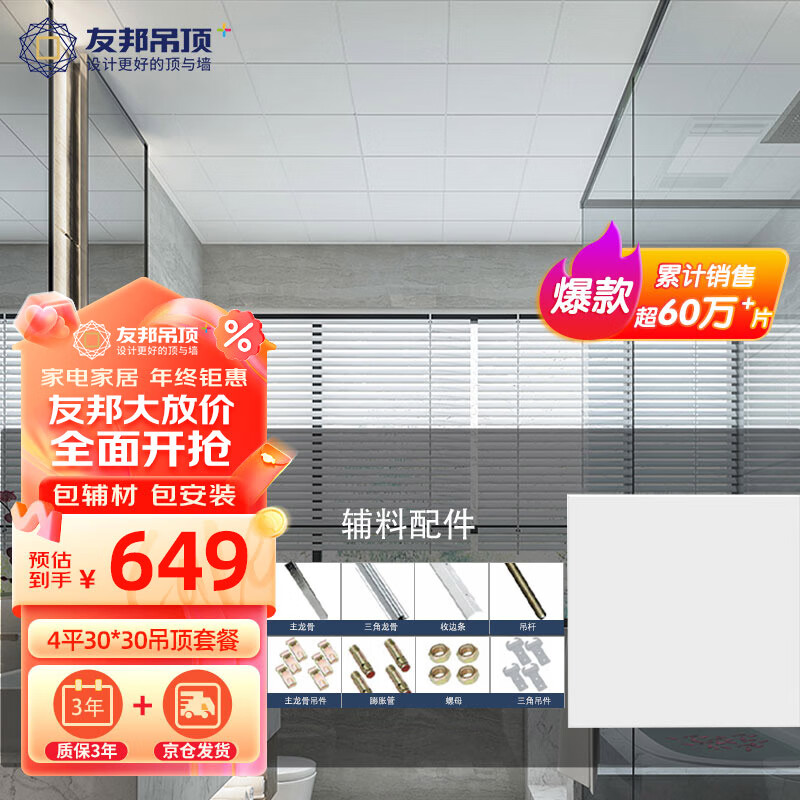 友邦(YOUPON) 集成吊顶铝扣板厨房阳台卫生间吊顶铝扣板天花板材料套餐包安装 主推4平【素华】JZM022价格:999.00元!