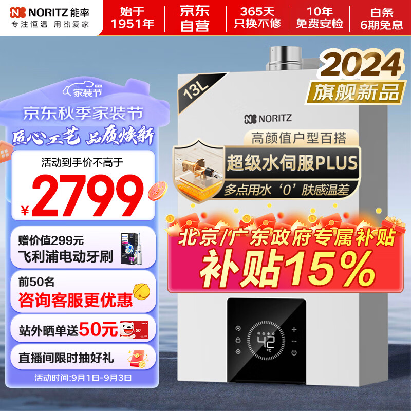 能率(NORITZ)【小云朵】13升燃气热水器 天然气 变频水伺服恒温 下置风机 综合降噪 GQ-13EA3AFEX以旧换新价格:2799.00元!