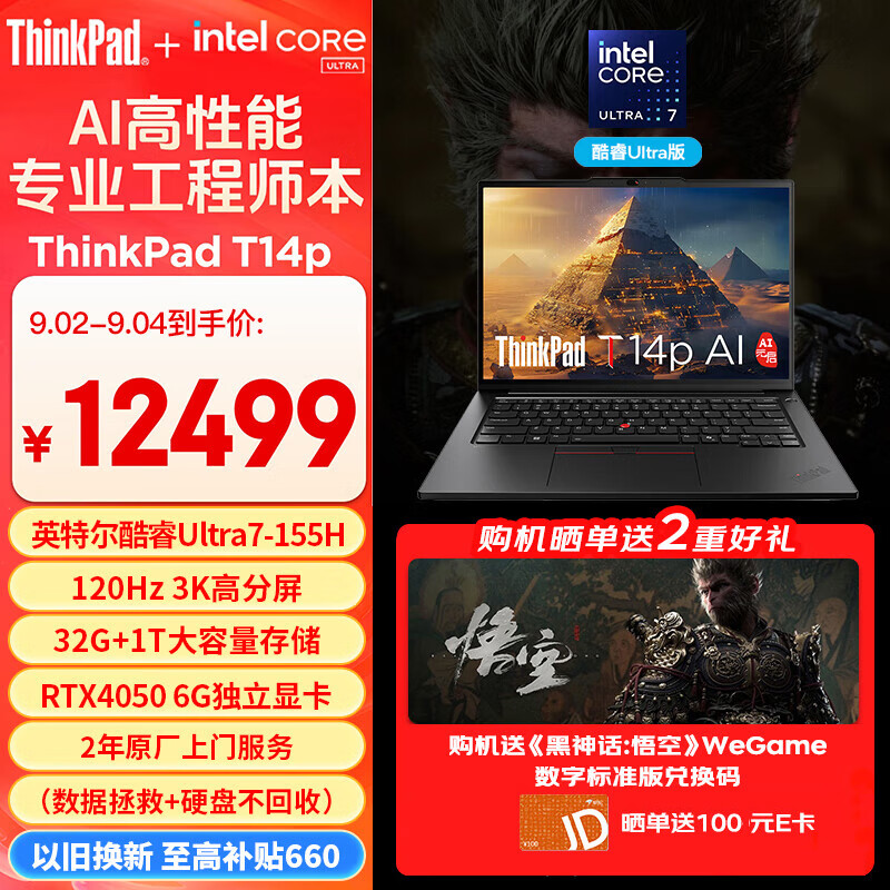 ThinkPad T14p AI PC 酷睿Ultra7 155H 14.5英寸高性能黑神话悟空笔记本电脑 32G 1TB 3K RTX4050价格:12499.00元!