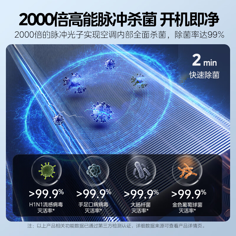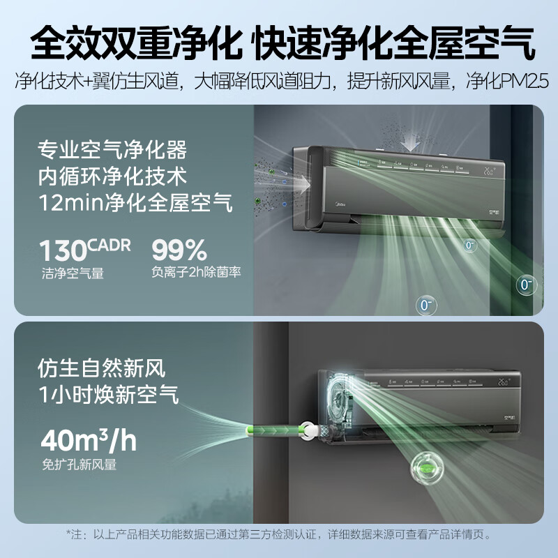 4、美的旋耀空调,一级能耗,AP达到4.74,双排铜管,外机无惧高低温天气,60度制冷,-30度制热,内机180度环绕风防止冷气直吹,还有APP智能控制!