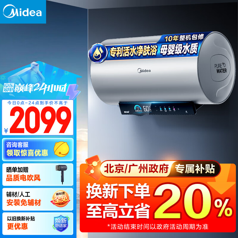 美的(Midea)TECH活水系列电热水器80升一级变频10重过滤终身免换镁棒家用储水式以旧换新F8025-RW7A(HE)价格:2299.00元!