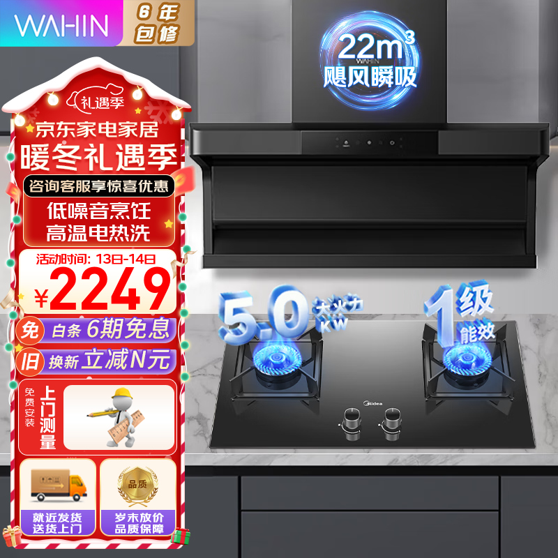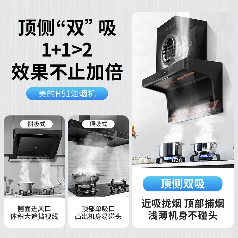 美的(Midea)出品抽油烟机7字型顶侧双吸22立方爆炒大吸力烟灶套装家用吸油烟机高温电热自清洗挥手厨房油烟机 【烟灶套装】H51搭配5.0KW猛火灶-液化气价格:2249.00元!