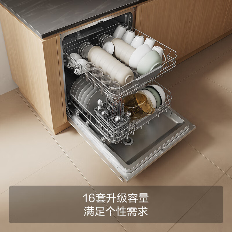 4、本以为16套很大,结果用起来发现,我们家5个人,还是要那么大才够。放口锅就占了很多空间。洗得挺干净,但锅铲上的粘住的东西没有洗干净。然后烘干也不是那么干。总体满意,解放手洗碗。