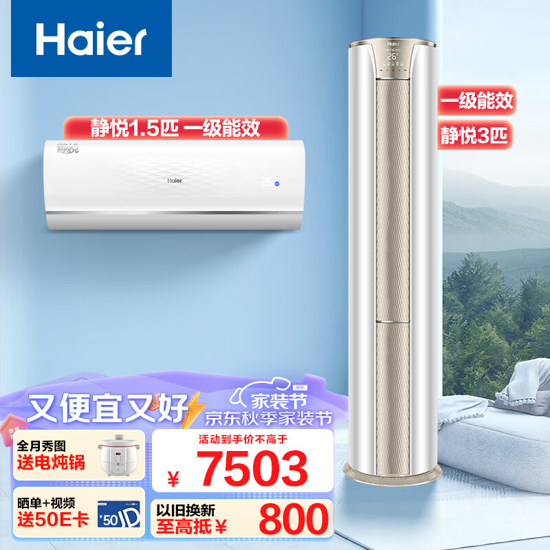 海尔(Haier)空调 新一级能效省电套装一室一厅(1.5匹一级挂机+3匹一级能效柜机)价格:7503.00元!