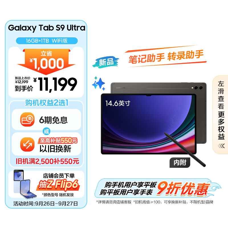 三星 Samsung S9 Ultra 14.6英寸平板电脑/AI智享学习办公/骁龙8Gen2/含S Pen 16G+1TB 云影灰WIFI价格:11199.00元!