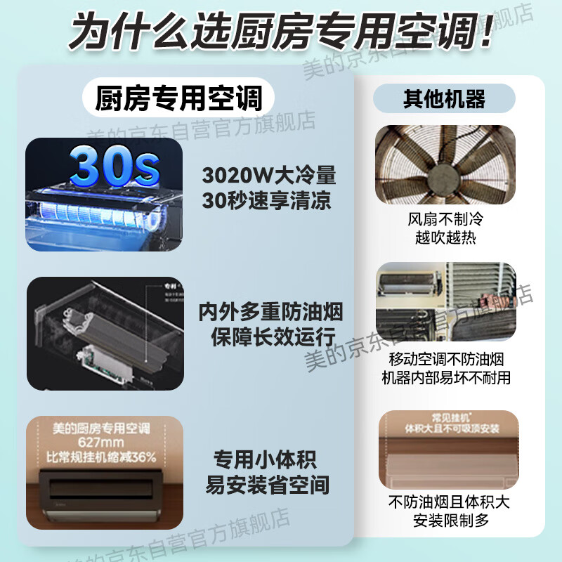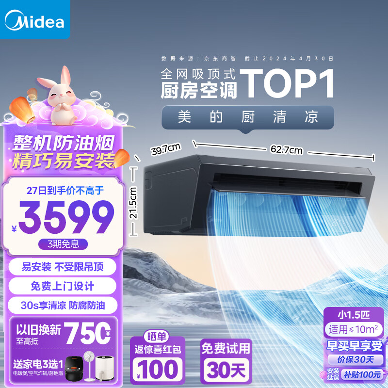 美的(Midea)厨清凉 厨房空调 专用吸顶式 小1.5匹变频 防油烟 大冷量 易安装CKF-30XW/BN8Y-XD300【曜石黑】价格:3499.00元!