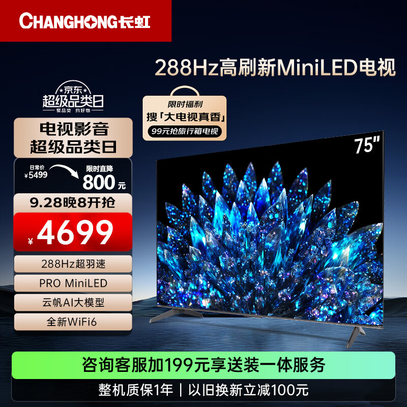 长虹电视75D8 MAX 75英寸288HzMiniLED游戏电视 4+64GB 4K超高清智能平板液晶LED电视机以旧换新价格:4699.00元!